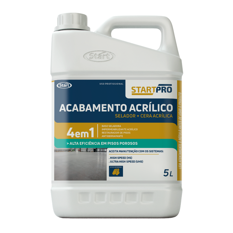 O Acabamento Acrílico 4 em 1 Start é um produto profissional desenvolvido para tratamento e proteção de pisos laváveis. Sua fórmula com polímeros acrílicos cria uma película protetora resistente, proporcionando brilho duradouro, maior impermeabilização e facilidade na manutenção diária.