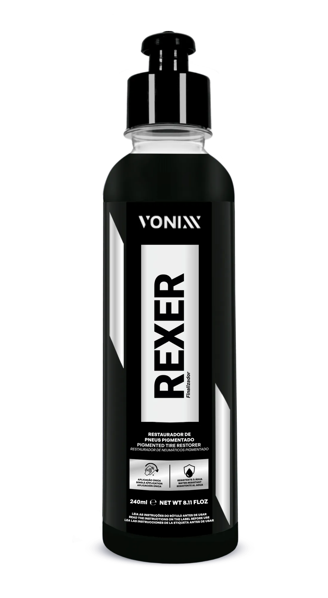 Com aplicação simples e secagem rápida, o Rexer revitaliza pneus, para-choques, frisos e borrachas, deixando um brilho intenso e uniforme sem deixar resíduos pegajosos. Além disso, ajuda a proteger contra o ressecamento, rachaduras e a ação dos raios UV, mantendo a aparência de novo por muito mais tempo.